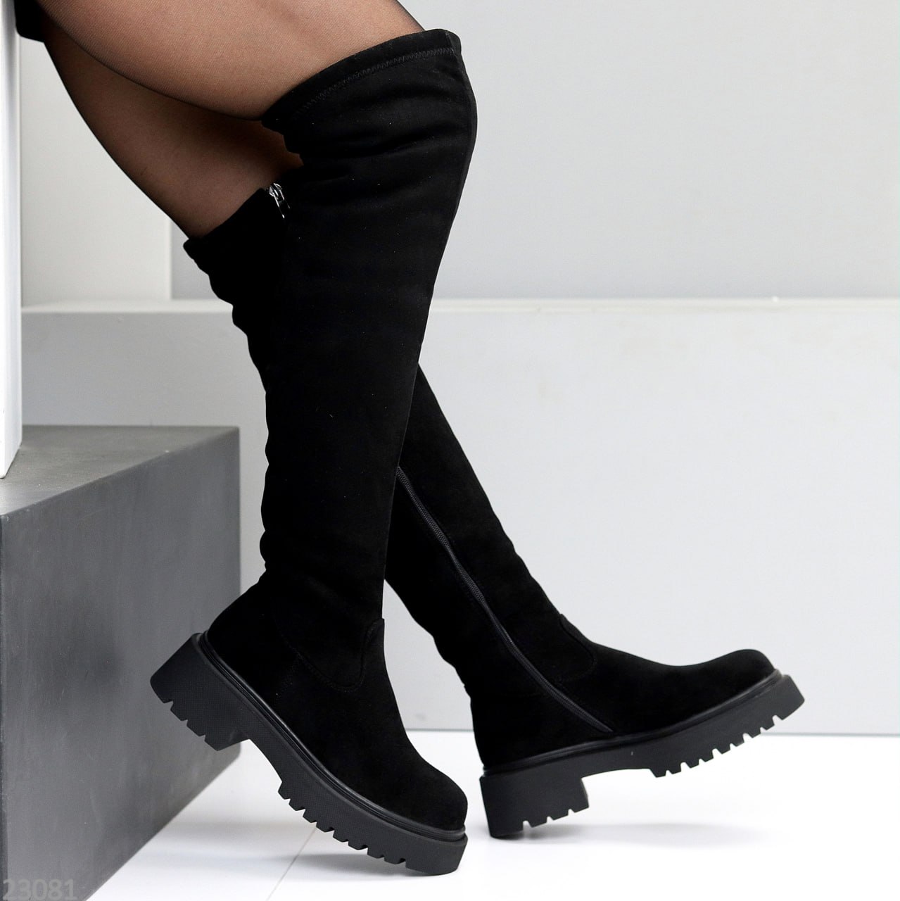 Код 23081 Розміри 36-40 Ботфорти "Rimala" Матеріал - Екозамша Всередині - Екохутро по всій довжині Сезон - Зима Колір - Чорний Висота від п'ятки - 51см Підошва - 5см/3см На середню стопу Розмір у розмір 36-23,5 37-24 38-24,5 39-25 40-25,5